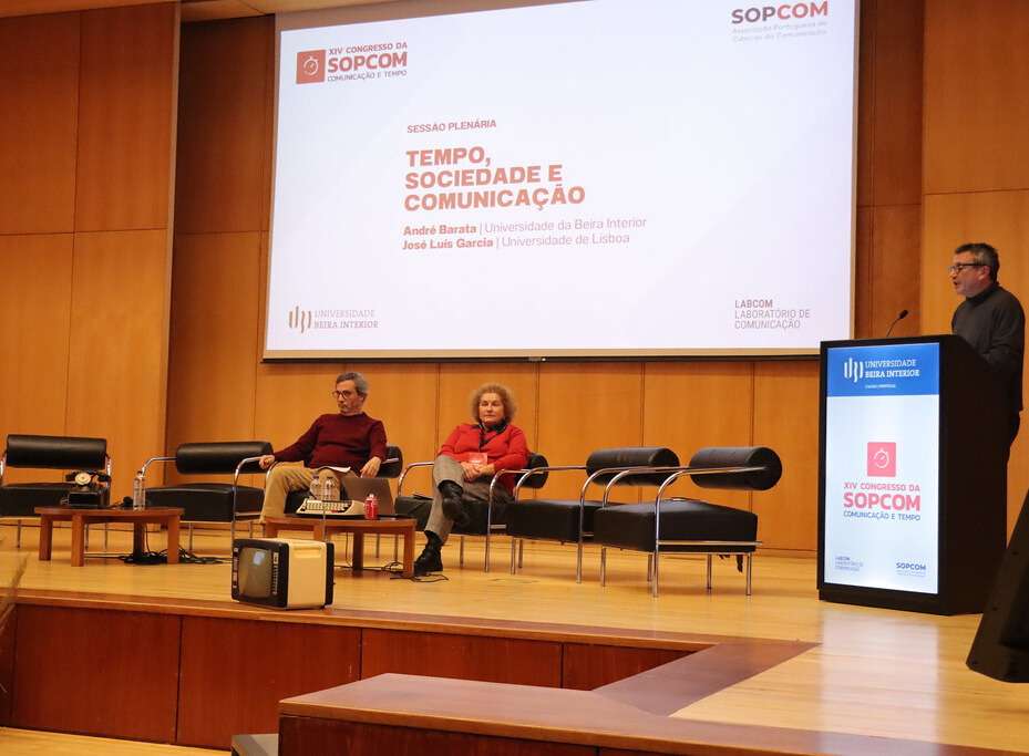 A última sessão plenária do SOPCOM 2026 realizou-se na tarde desta quarta-feira, dia 11, no Auditório das Sessões Solenes da UBI. O professor catedrático da UBI, André Barata, e o investigador sénior do Instituto de Ciências Sociais da Universidade de Lisboa, professor José Luís Garcia, estiveram à frente do debate sobre tempo, sociedade e comunicação.